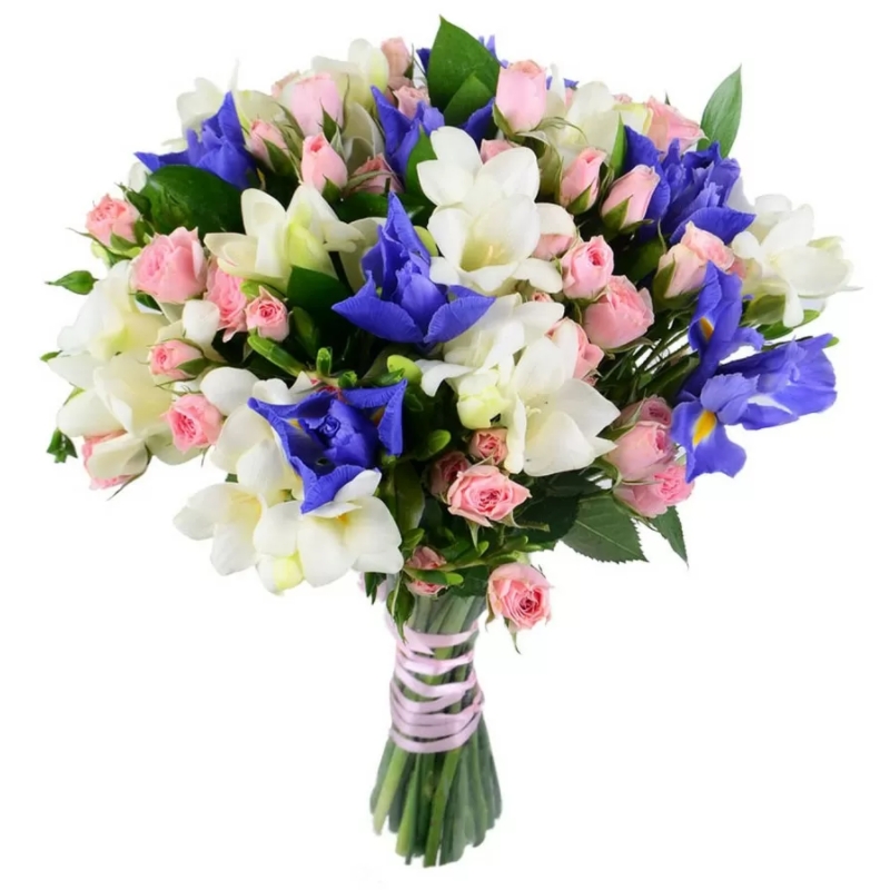 Букет состоит из 5 кустовых роз, 10 ирисов, 10 фрезий, прозрачная упаковка, атласная лента.